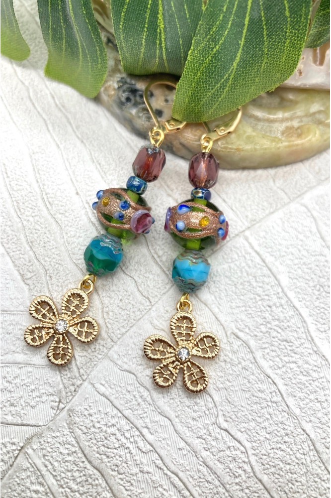 Boucles d’oreilles composées de superbes perles tchèques et indiennes et de pendentifs en métal.