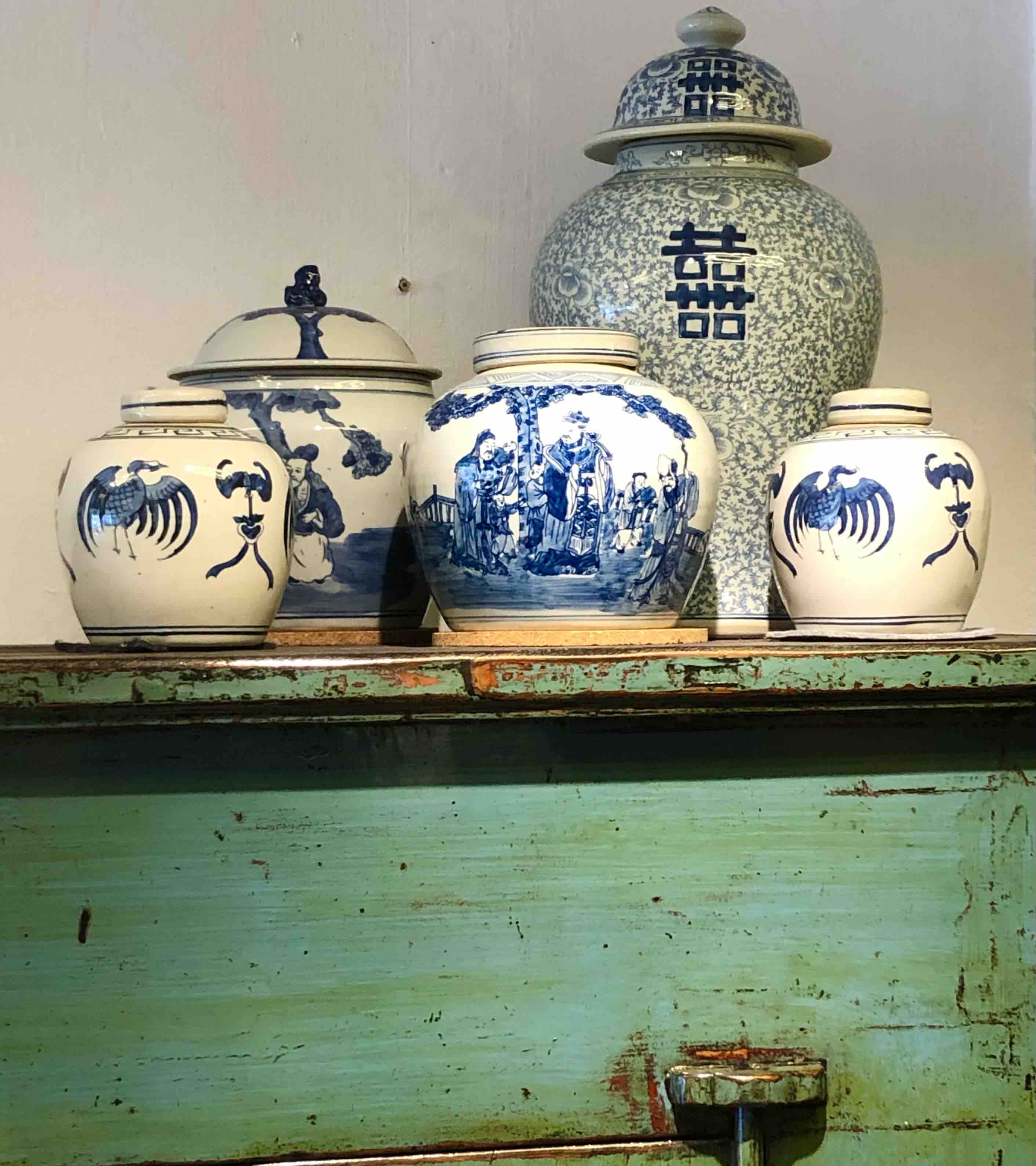 Décoration que j'adore: des pots chinois sur un vieux meuble