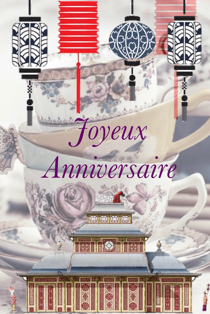 Carte-cadeau "Joyeux Anniversaire", avec un visuel de tasse et de lanternes chinoises.